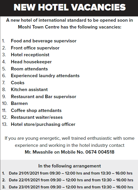 - Company: Various Hotel Jobs in Moshi (Kilimanjaro)
